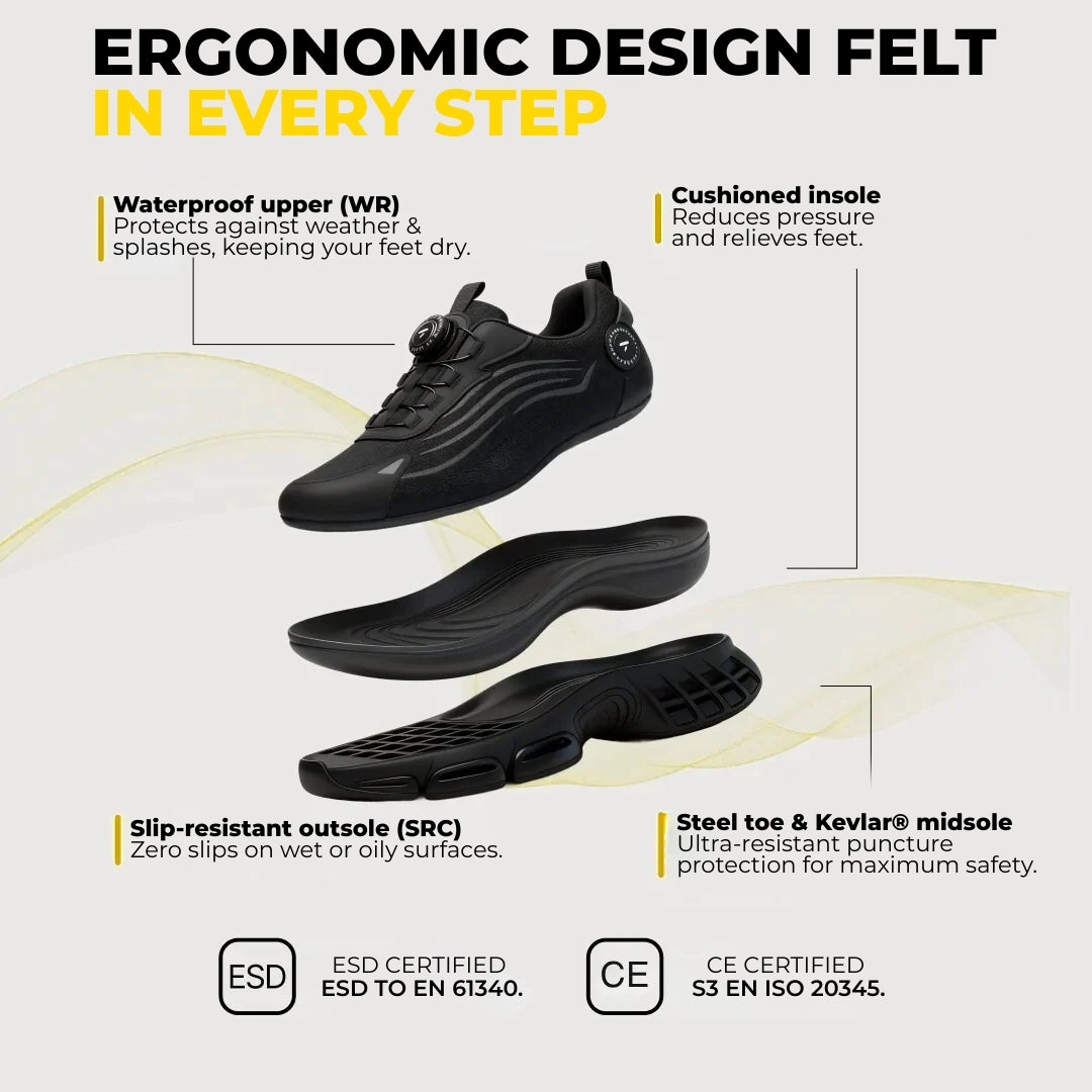 Although designed with a sneaker look, our shoes use high-strength industrial materials: reinforced mesh, sealed stitching, and a professional slip-resistant sole.